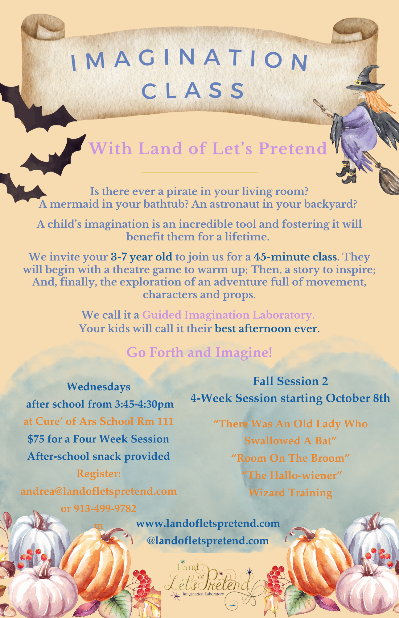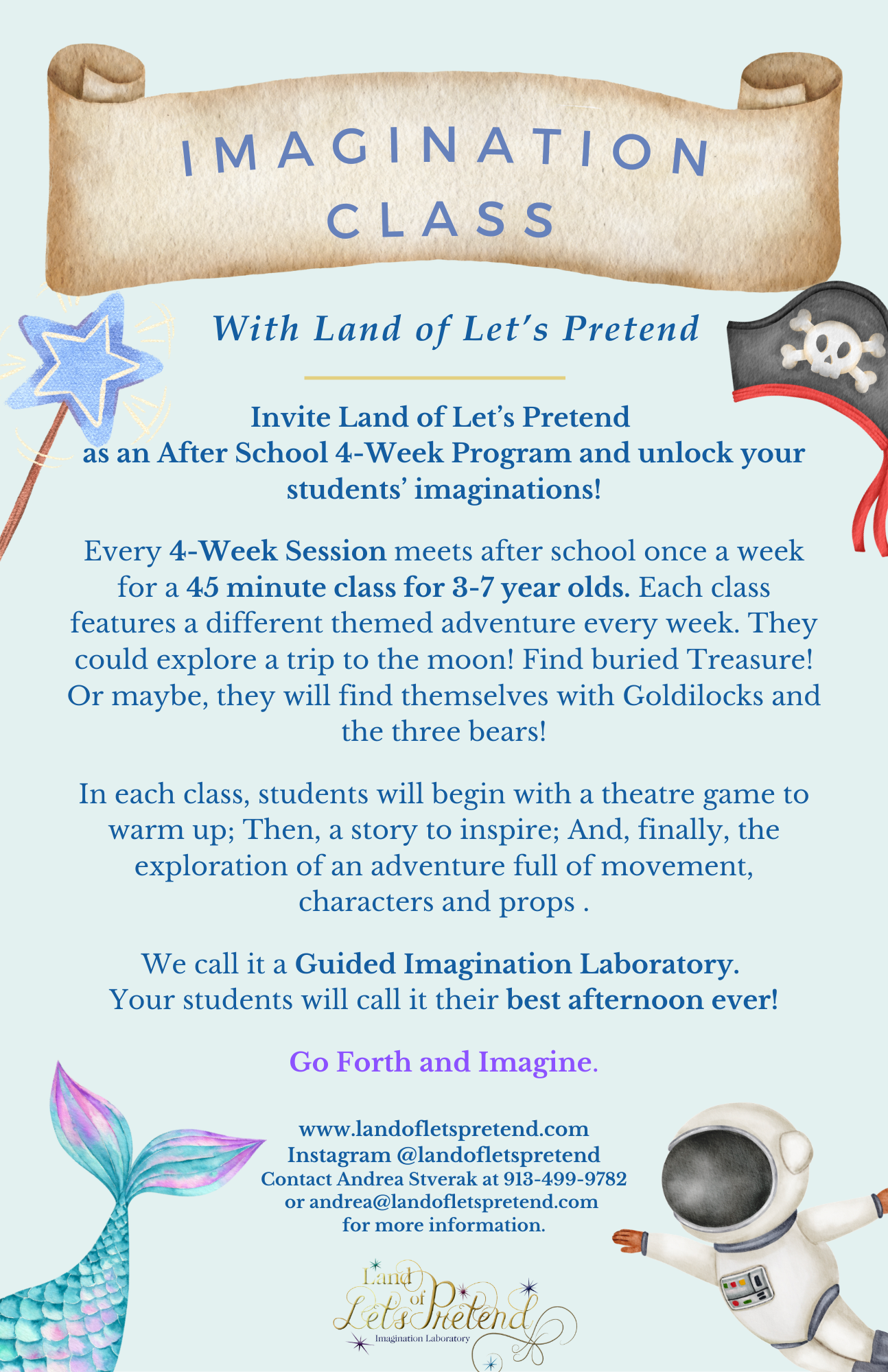 Bring a 4-week Land of Let’s Pretend Laboratory to your School to offer as an after-school activity. The 4-week session meets once a week for 45 minutes and is a perfect way for kids to unwind after school! We will provide the props, inspiration, and the adventure - and they will provide the Imagination!